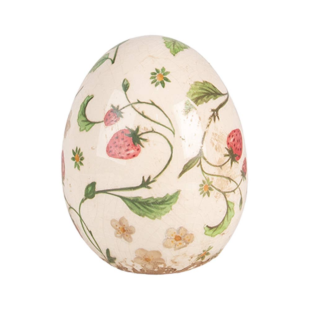 Unser zauberhaftes Keramik-Ei verzaubert mit niedlichen Erdbeer-Dekor und frischen grünen Akzenten. Die perfekte Frühlingsdeko für Sideboard, Tisch oder Fensterbank – ein verspielter Hingucker mit natürlichem Charme!