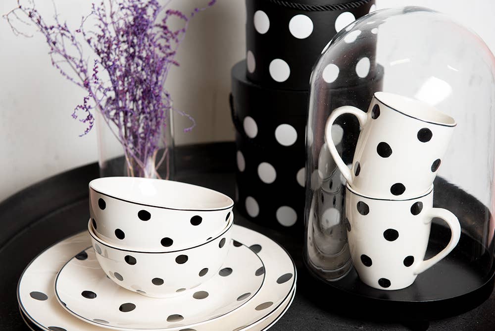 In einer zauberhaften Küche, in der Erinnerungen lebendig werden, liegt ein Speiseteller in Schwarz-Weiß mit Punkten. Er erzählt Geschichten von festlichen Zusammenkünften und gemütlichen Abenden. Dieser Teller ist nicht nur Geschirr, sondern ein liebevoller Begleiter für unvergessliche Mahlzeiten.