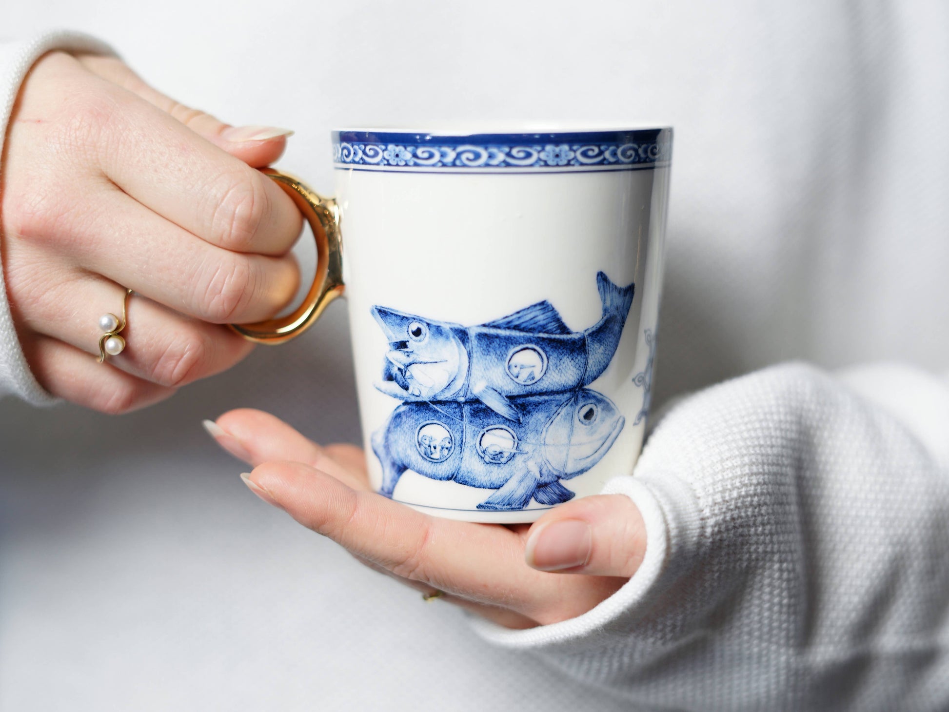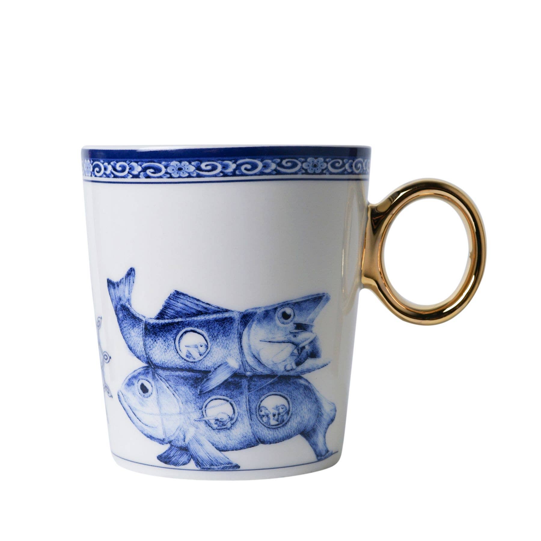 Eine Delfter blaue Tasse mit dem Sternzeichen Fische darauf. Diese Tasse mit Sternzeichen wurde von dem bildenden Künstler Redmer Hoekstra entworfen. Seine Illustrationen erkennt man sofort an ihrem humorvollen und verträumten Stil. Ein bunter Umzug surrealistischer Figuren aus dem Tierkreis, die in die Welt von Heinen Delfts Blauw einmarschieren, kriechen oder rollen. Bekannte Vasen und Geschirrstücke sind die ungewöhnlichen Transportmittel dieser astrologischen Tiere. Diese besondere Kollektion von Tassen entführt dich in eine neue Welt voller Humor. Auf dieser Tasse hat Redmer Hoekstra seine eigene Interpretation des Sternzeichens Fische geschaffen. Als echte Visionäre haben die Fische einen Weg gefunden, ihre Welt mit der der Vögel zu vereinen. Sanftmütig wie sie sind, bieten sie sich liebevoll an, um die Vögel zu ihrer Bestimmungsort zu bringen. Unterwegs können sie von all den schönen Dingen träumen, die ihnen begegnen.