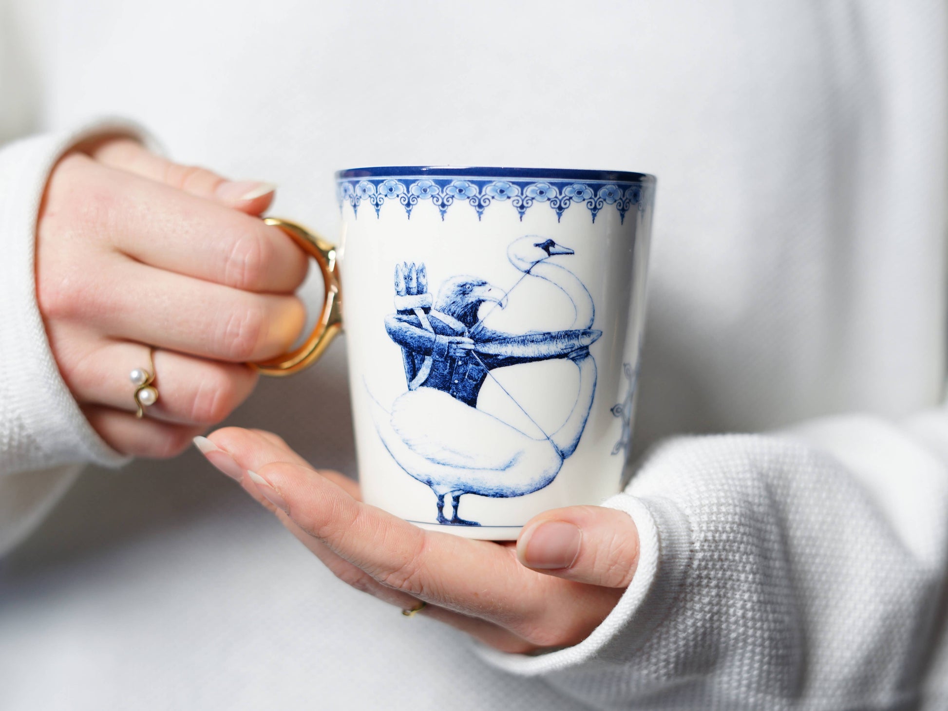 Eine Delfter blaue Tasse mit dem Sternzeichen Schütze darauf. Diese Sternzeichentasse wurde von dem bildenden Künstler Redmer Hoekstra entworfen. Seine Illustrationen erkennt man sofort an ihrem humorvollen und verträumten Stil. Ein bunter Umzug surrealistischer Figuren aus dem Tierkreis, die in die Welt von Heinen Delfts Blauw einmarschieren, kriechen oder rollen. Bekannte Vasen und Geschirrstücke sind die ungewöhnlichen Transportmittel dieser astrologischen Tiere. Diese besondere Tassenkollektion entführt dich in eine neue Welt voller Humor. Auf dieser Tasse hat Redmer Hoekstra seine eigene Interpretation des Sternzeichens Schütze gestaltet. Der lange Hals des majestätischen Schwans eignet sich hervorragend, um gezielt Fische durch den selbstbewussten Adler abzufeuern. Ein besonders schönes Geschenk für jemand anderen oder für dich selbst, damit du immer dein eigenes spirituelles Tier in deiner Nähe hast.