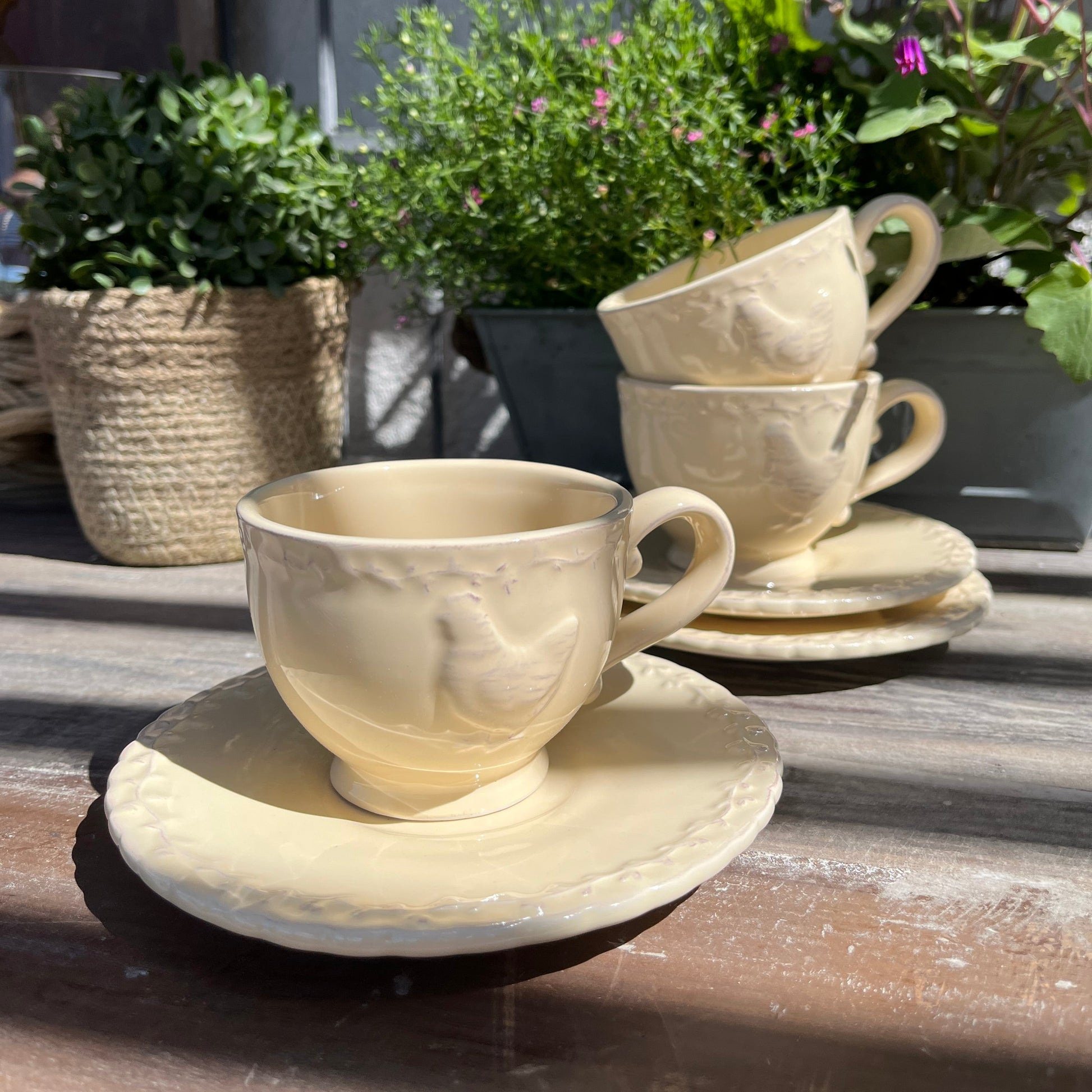 Eine Tasse mit passender Untertasse, aus feiner beigefarbener Keramik, strahlt zeitlose Eleganz aus. Ihre Vintage-Anmutung erzählt Geschichten von gemütlichen Nachmittagen und liebevollen Begegnungen. Jeder Schluck aus diesem bezaubernden Geschirr ist wie eine Umarmung für die Seele, ein kleines Stückchen Nostalgie, das den Alltag verzaubert.