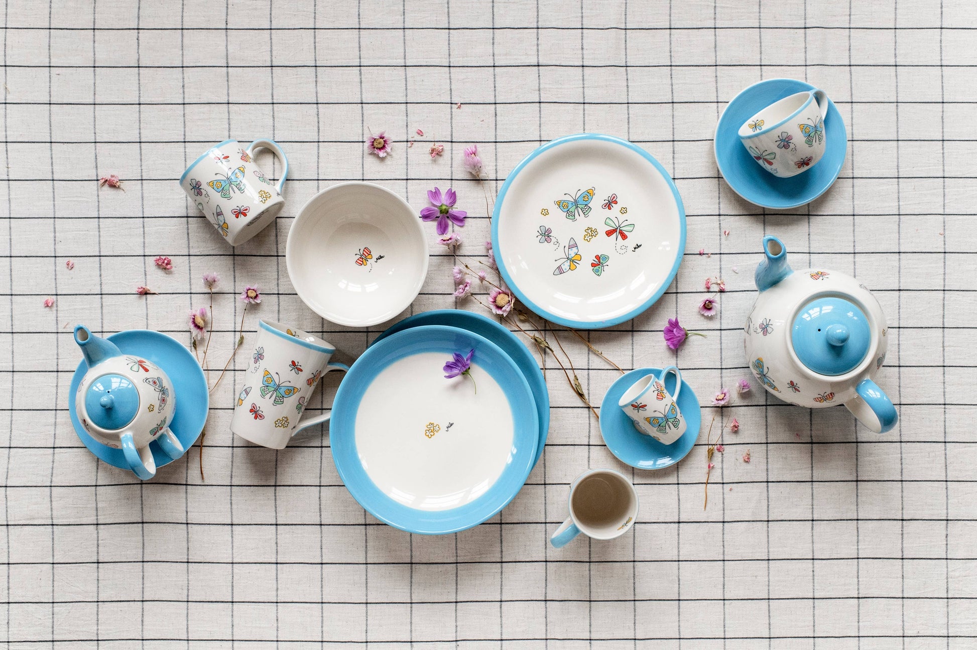 Etwas Boheme-Chic, ein Mustermix ... verspielt und leicht. Unsere zarten Schmetterlinge tanzen im Frühling ... wundervoll anzusehen, schenkt dieses Design Glücksgefühle. Ein reiches Farbmuster in fröhlichen Farbtönen und ein schöner Rapport machen das Zusammenspiel von Keramik und Design perfekt. Für die Familie und für Freund*innen. Feel Free & fly away.