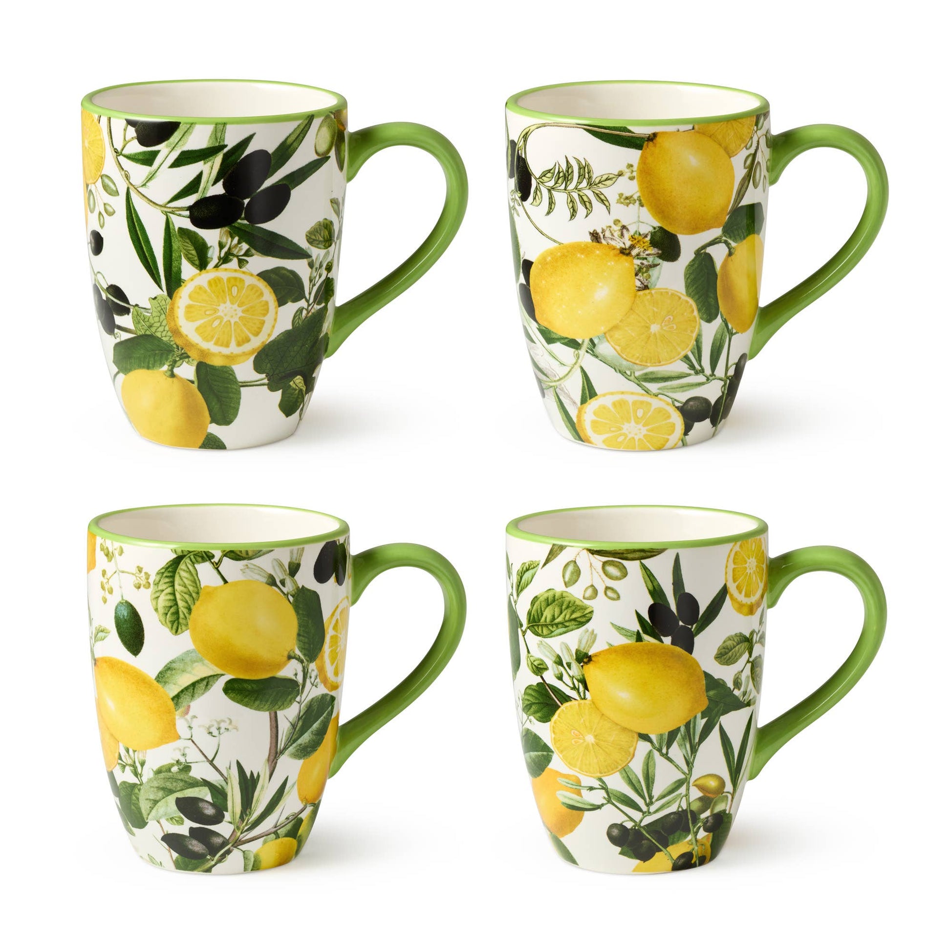 Beginne deinen Morgen mit einem Hauch mediterranen Charmes dank unseres Limone-Sets aus 4 Keramikbechern. Jeder Becher verzaubert mit einzigartigem Zitronen- und Olivenzweig-Design in frischen Grün- und Gelbtönen. Diese Becher bringen Lebendigkeit auf deinen Tisch und sind perfekt für Kaffee, Tee oder heiße Schokolade. Die komfortablen Griffe sorgen für angenehmen Genuss bei jedem Schluck. Hergestellt aus hochwertiger Keramik, sind sie langlebig und mikrowellengeeignet – ideal für deinen Alltag! Set = 4 Tassen