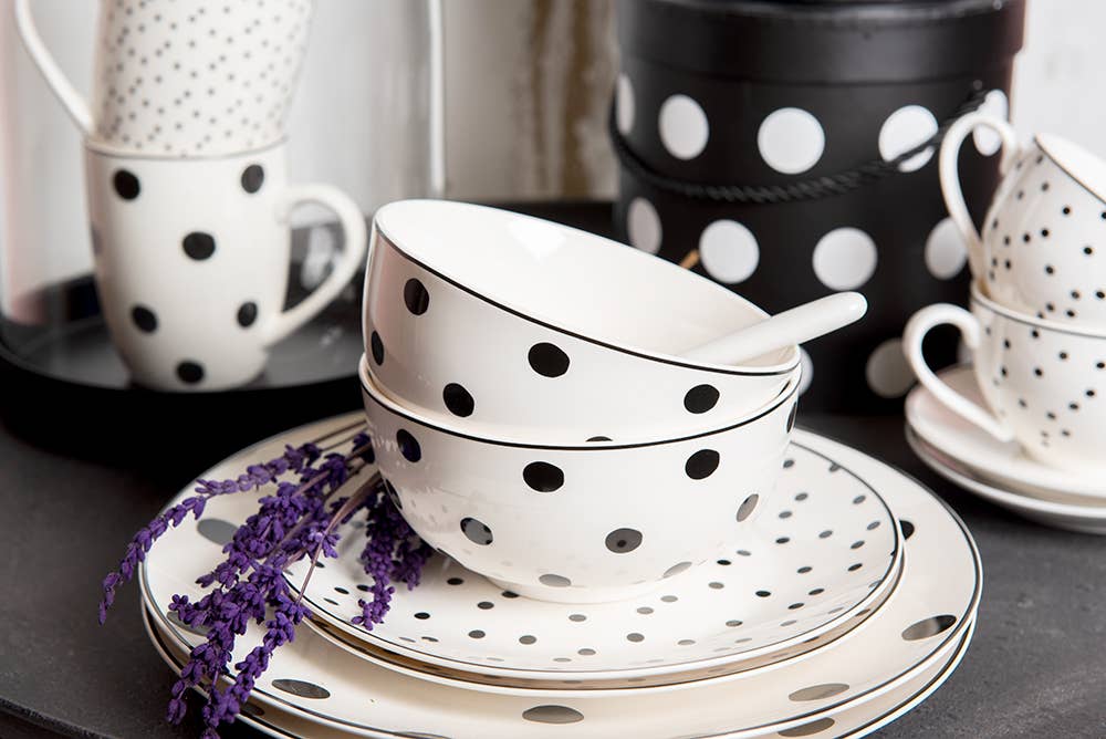 Auf dem liebevoll gedeckten Tisch mit diesen Frühstückstellern in Schwarz-Weiß erwartet Sie eine behagliche Atmosphäre. Die eleganten Kontraste ziehen die Blicke an, während die zarten Punkte ein Gefühl von Verspieltsein vermitteln. Hier beginnt der Tag mit einem Hauch von Stil und einer Portion Leidenschaft für das Schöne im Alltäglichen. Guten Appetit!