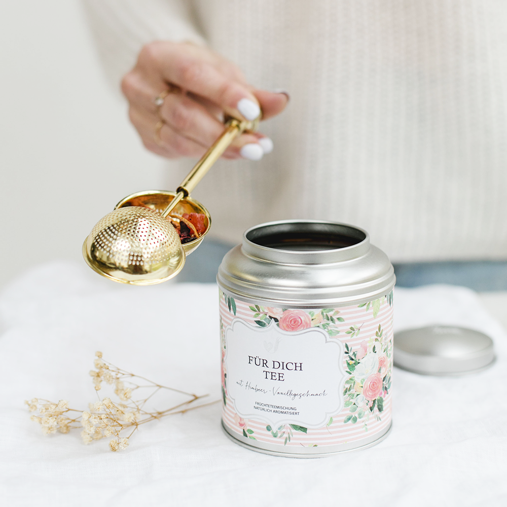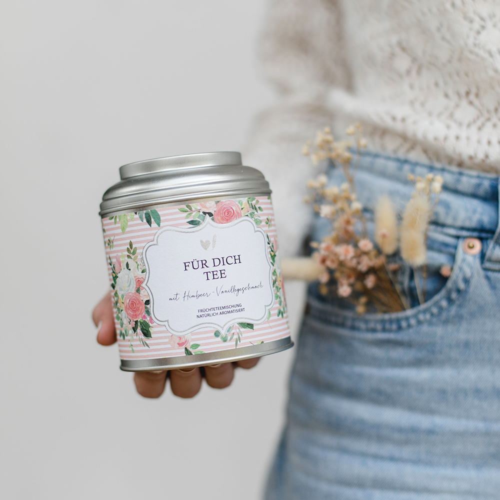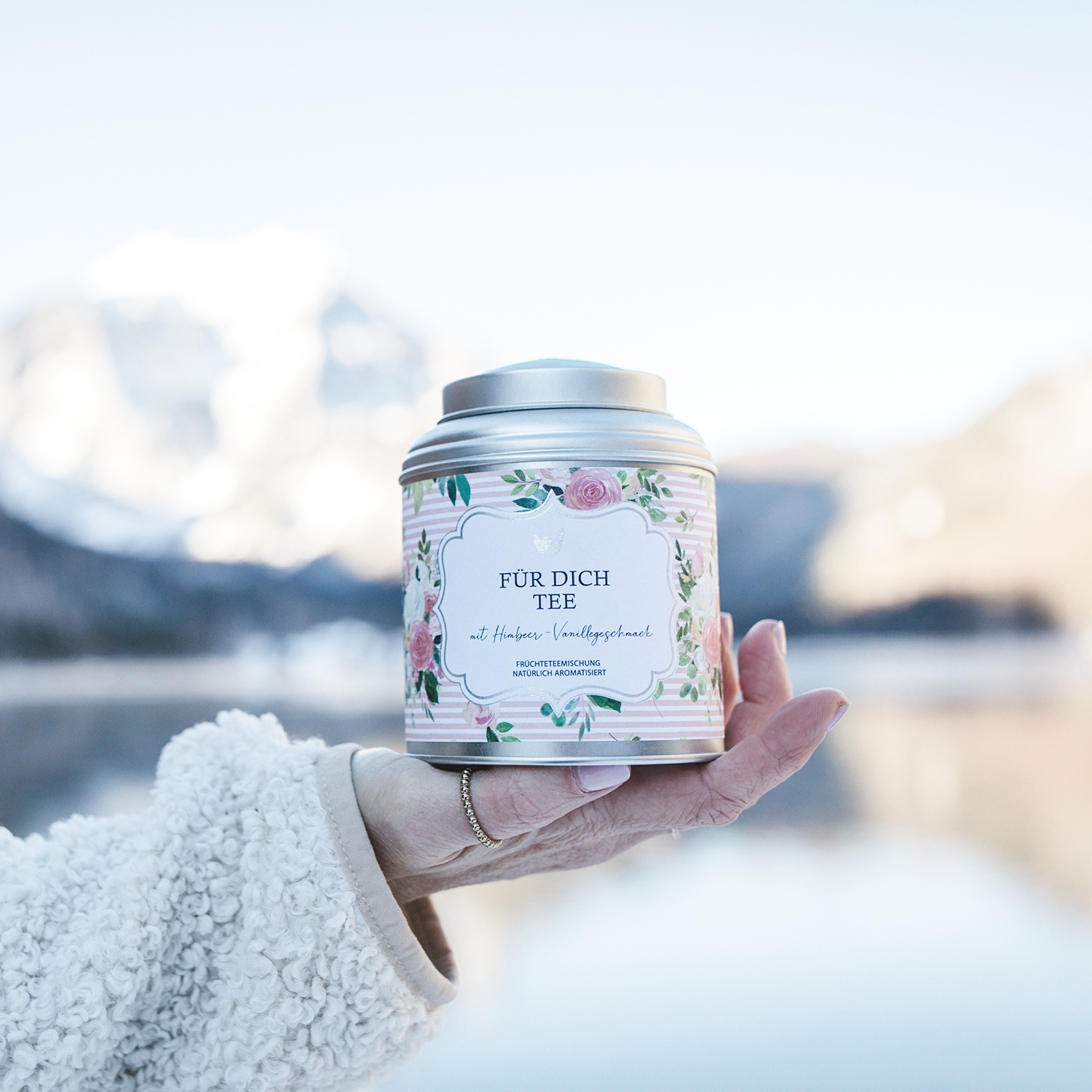 Früchteteemischung mit Himbeer-Vanille-Geschmack, natürlich aromatisiert Für dich! Mit diesem fruchtig-süßen Tee machst du deinen Liebsten oder dir selbst ein liebevolles Geschenk. Das Himbeer-Vanille-Geschmack des Für dich Tees sorgt für eine angenehme Süße mit einem bierigen Aroma. Der Tee wärmt im Winter von innen, im Sommer kann er auch kalt mit Eiswürfeln genossen werden als fruchtiger Eistee. Perfekt für einen Tee am Morgen oder am Nachmittag zu einer süßen Jause.