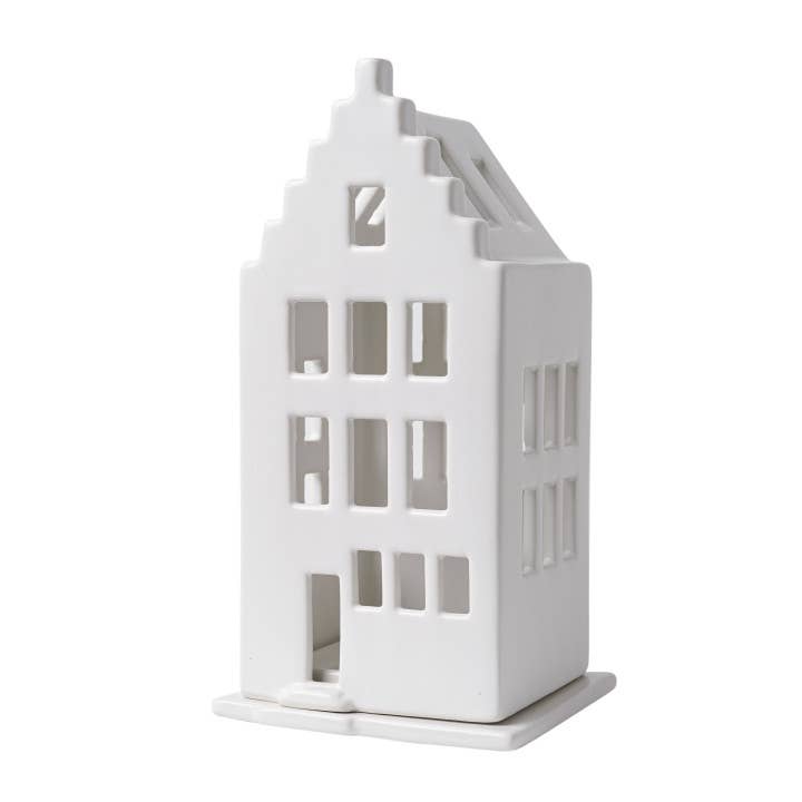 Kuscheliger Teelichthalter in Form eines charakteristischen Kanalhauses. Dieses Haus hat einen Treppengiebel, ist komplett weiß und fällt daher besonders an dunklen Tagen auf. Schaffen Sie in Ihrem Wohnzimmer eine ganze Straße mit hellen Kanalhäusern mit unterschiedlichen Fassaden und Farben. Es ist fast so, als würde man an einem dunklen Winterabend durch die Straßen von Amsterdam laufen! Auch ein ideales Geschenk für die Feiertage.