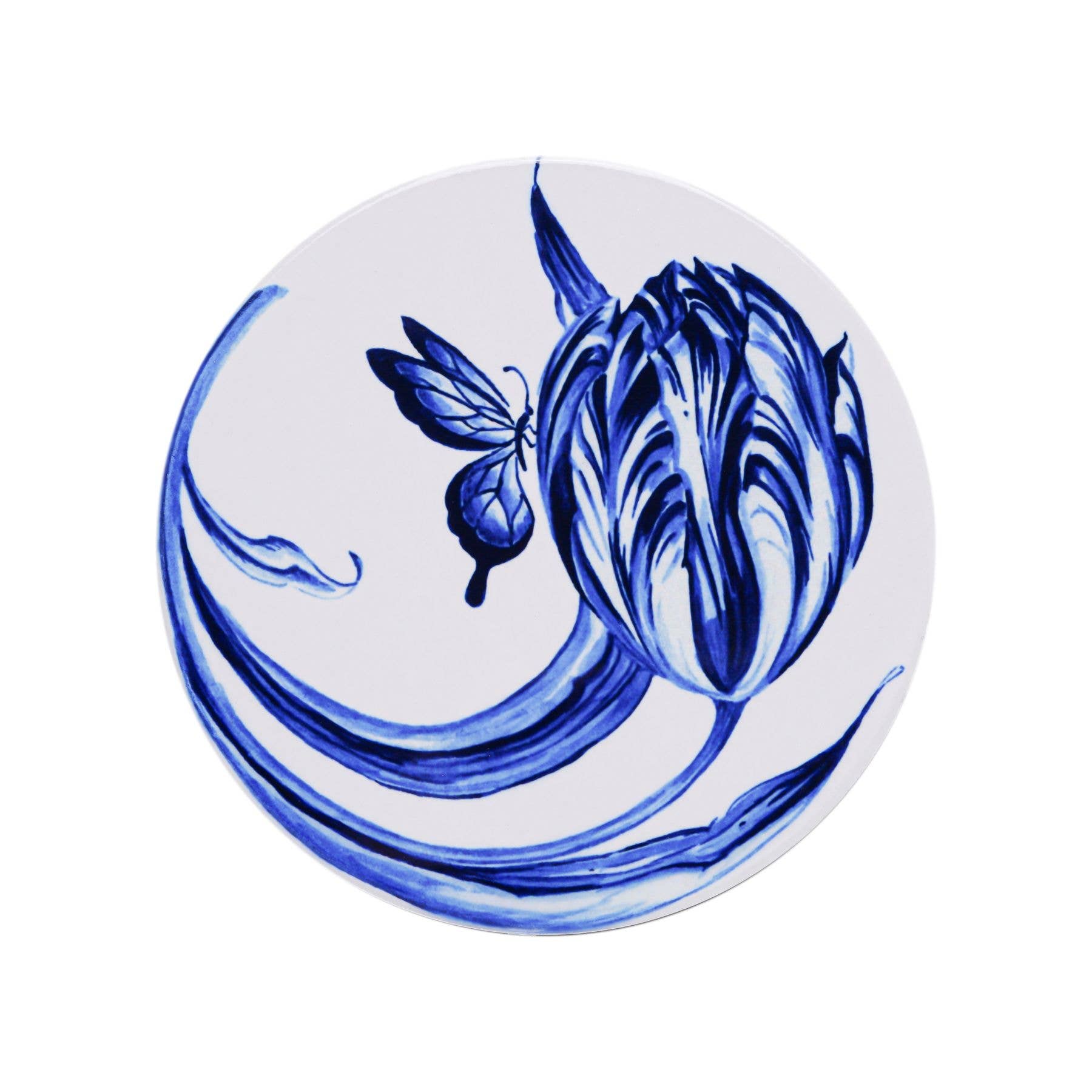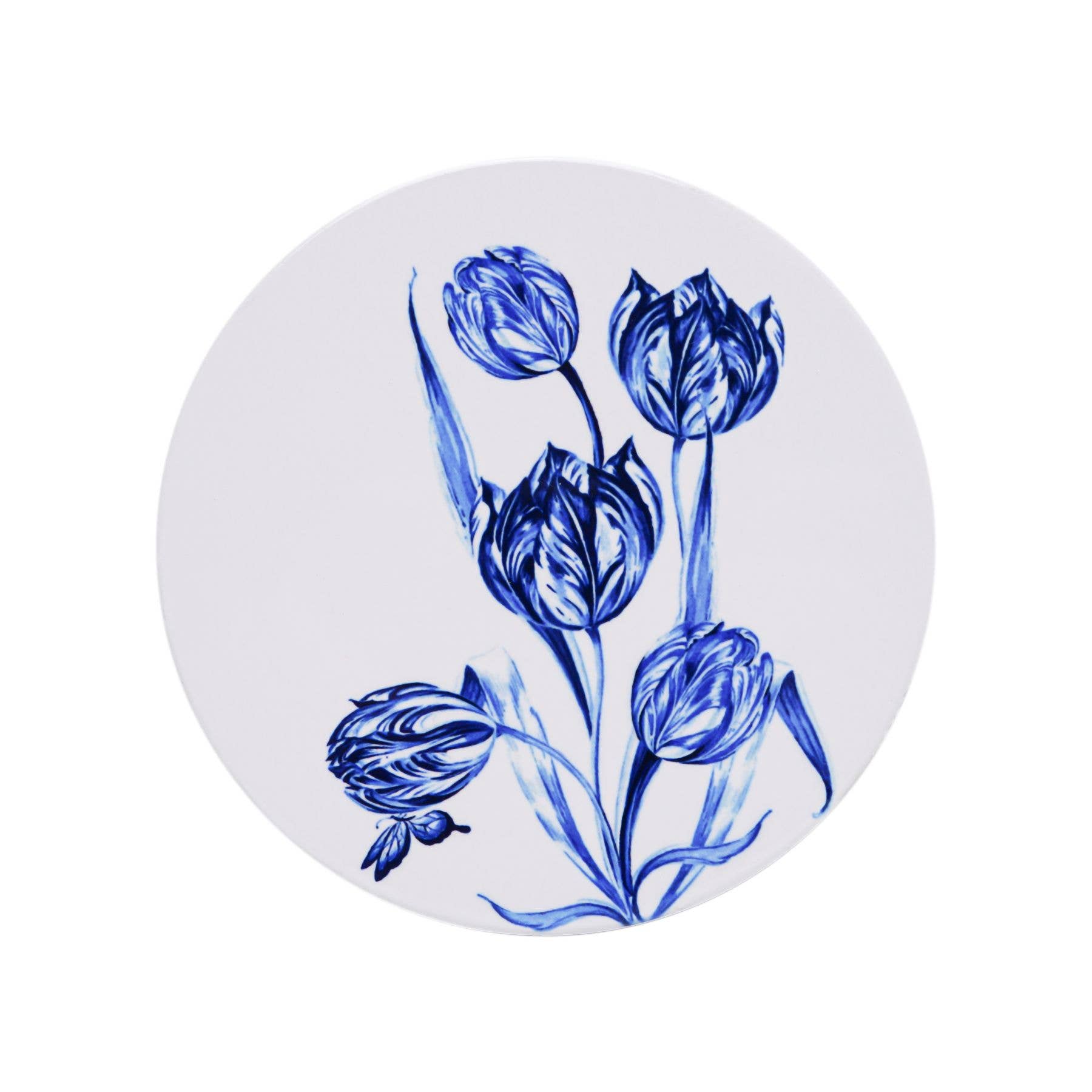 Ein Set aus vier verschiedenen Untersets für Gläser und Tassen. Die Untersetzer sind aus Keramik gefertigt und haben an der Unterseite eine Korkschicht, um sie sicher auf den Tisch oder die Arbeitsplatte stellen zu können. Die Untersetzer sind mit üppigen Delfter blauen Tulpen verziert. Set = 4 Stück