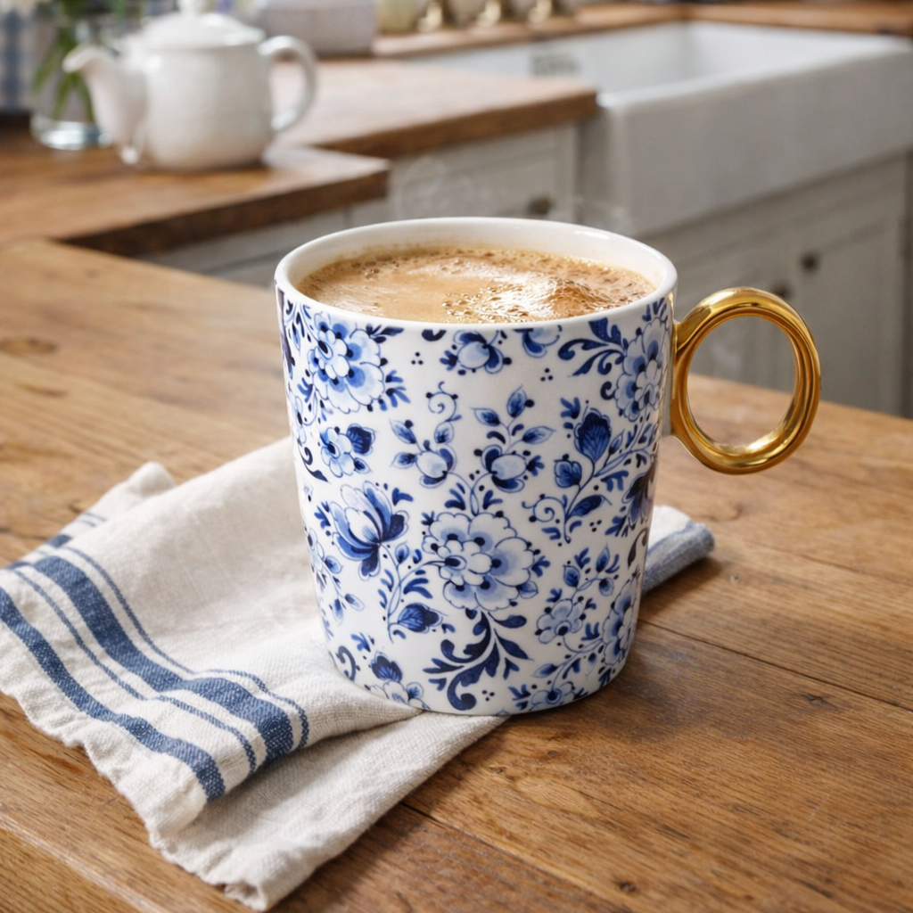 Diese elegante Tasse ist mit eleganten blauen Delfter Blumen verziert, die rund um die Tasse verlaufen. Der Höhepunkt der Delfter Blaukeramik! Das elegante Goldohr verleiht der Tasse einen schönen, modernen Look. Die Kollektion der blauen Delfter Tassen besteht aus vielen verschiedenen Bildern und jeder Ohrhörer ist auch etwas anders, sodass es besonders viel Spaß macht, verschiedene Tassen miteinander zu kombinieren.