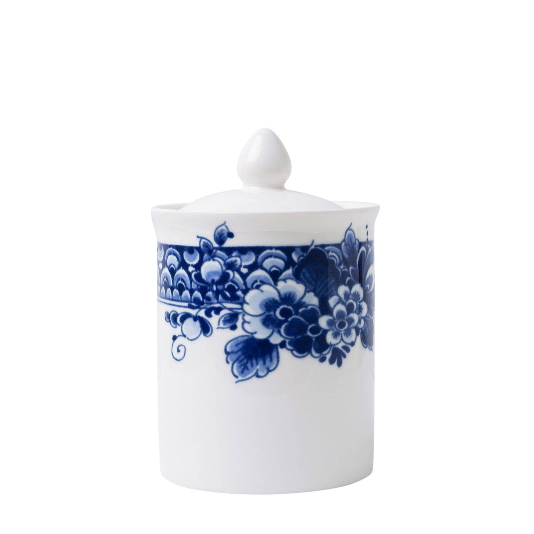 Dieser elegante Vorratstopf ist Teil der Paauw Blauw Kollektion von Heinen Delfts Blauw. Der Porzellanvorratstopf ist in zwei verschiedenen Größen erhältlich, wobei dies die kleinere Version ist. Der Vorratstopf hat eine gerade zylindrische Form mit einem eleganten Deckel obenauf. Rund um den Vorratstopf verläuft eine Delfter blaue Dekoration, ein beeindruckendes Muster aus Pfauenfedern und Blumen. Pfauenfedern waren schon immer wegen ihrer Schönheit beliebt, aber sie sind auch ein Symbol für Liebe und Glück und wurden oft als Statussymbol getragen, insbesondere im alten Kaiserreich China. Für Heinen Delfts Blauw hat der Pfau eine besondere Bedeutung. Dieses Geschirr ist nämlich gleichzeitig eine Hommage an unsere ehemalige Delfter Blau Fabrik, die den Namen 'De Paauw' trug. Eine Töpferfabrik, die bereits seit 1651 existierte und damals unter dem Namen 'De Delftse Pauw' produzierte.