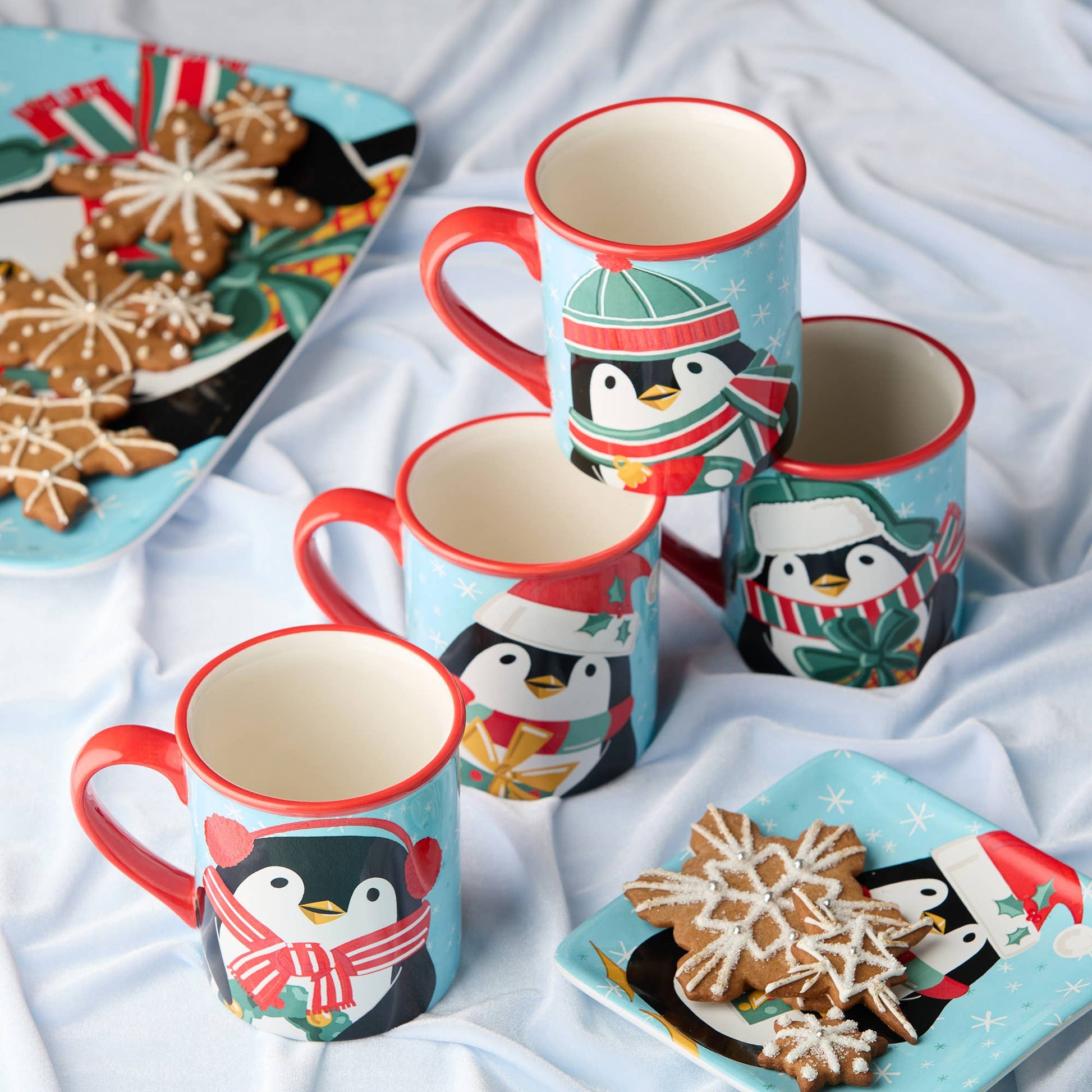 Das Weihnachts-Whimsy-Pinguin-Tassen-Set ist einfach zauberhaft! Vier lustige Pinguin-Designs, gekleidet in festliche Schals, Ohrenschützer und Weihnachtsmützen, versüßen jede Tasse heißen Kakao. Der schneebedeckte blaue Hintergrund und die leuchtend roten Griffe und Ränder sorgen für pure Festtagsfreude. Egal, ob Du gemütlich am Kamin sitzt oder einem Freund eine Freude machst, diese Keramiktassen bringen Lächeln und Wärme in jedes Weihnachtsfest. Perfekt zum Einkuscheln und Genießen!
